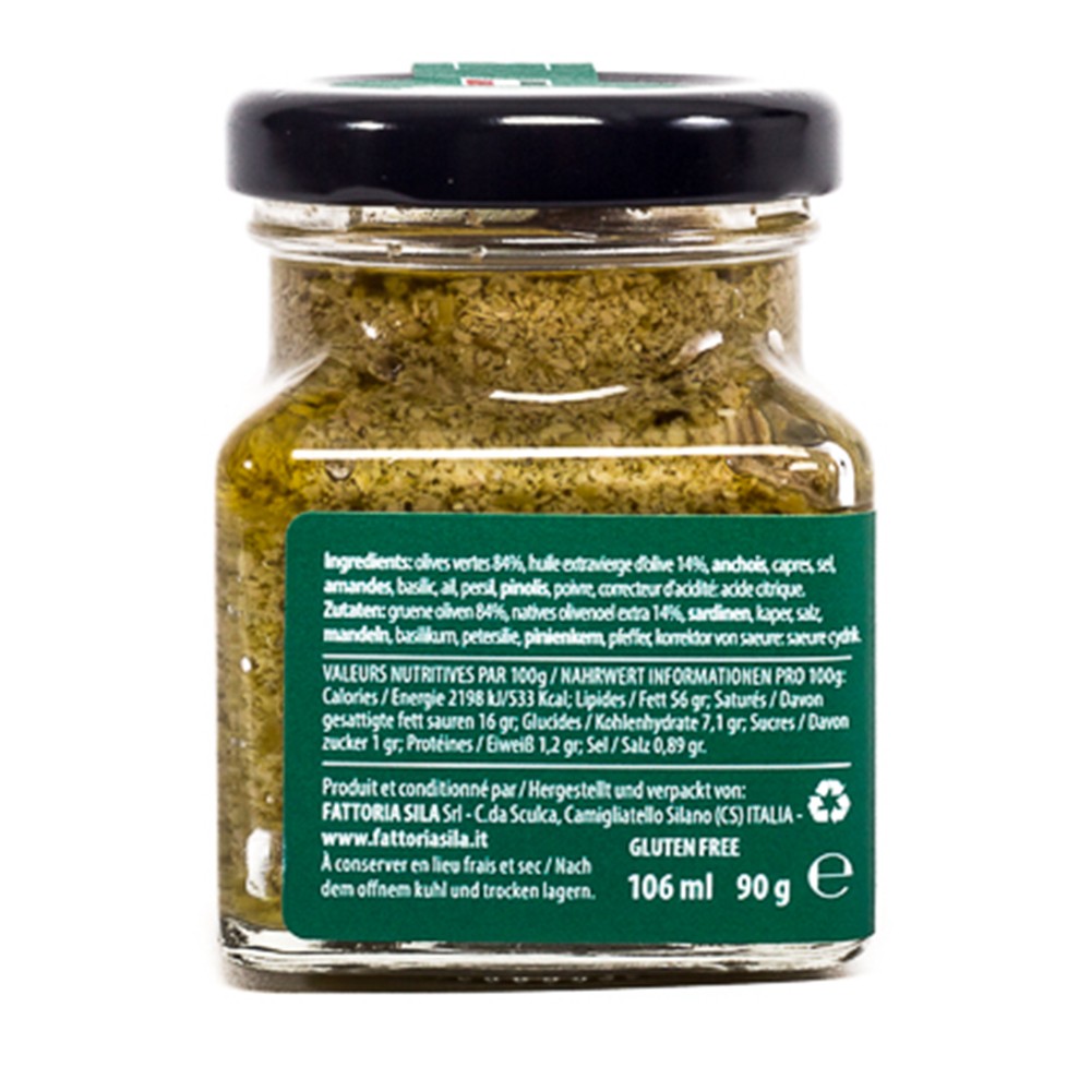 Composition | Olive verte 84%, huile d’olive extra vierge 14%, anchois, câpres, sel, amandes, basilic, ail, persil, pignons de pain, poivre. Correcteur d’acidité : acide citrique. |