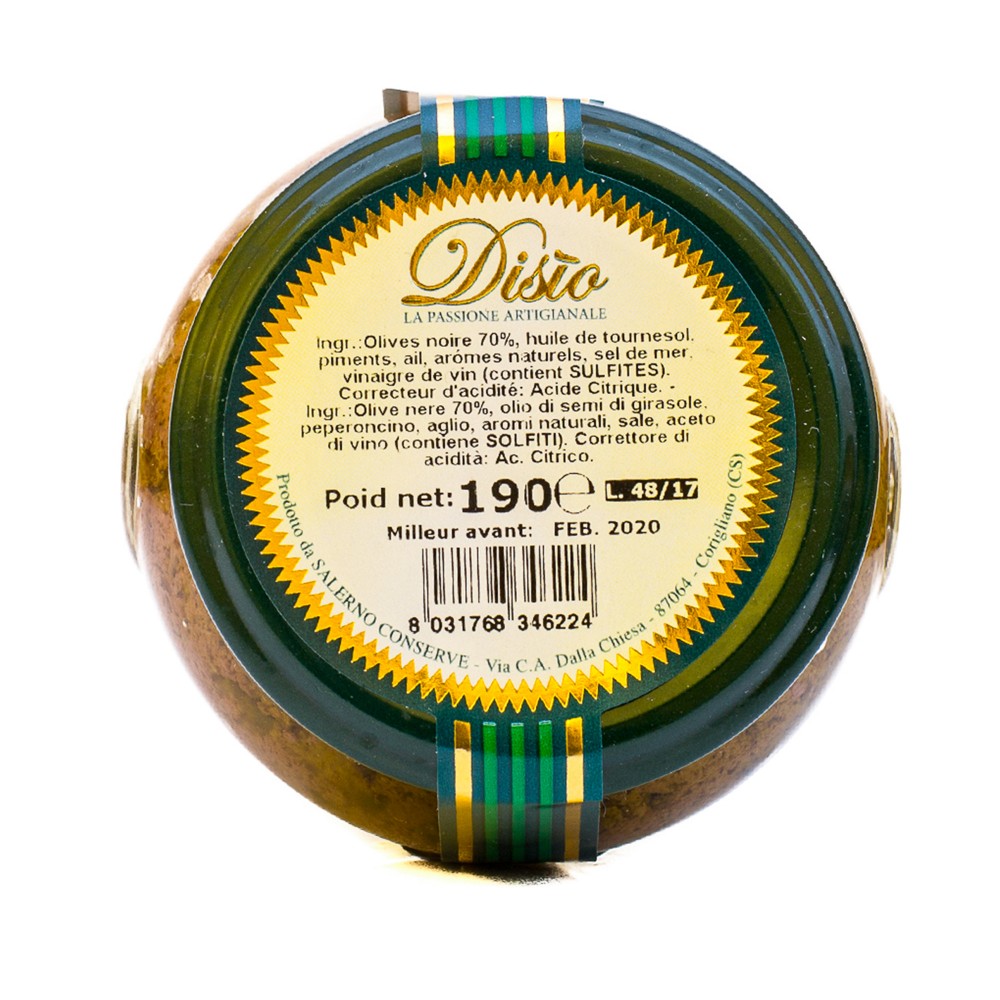Composition | Olive noire 70%, huile de tournesol, ail, piment, aromes naturels, sel de mer, vinaigre de vin (contient des sulfites). Correcteur d’acidité : acide citrique. |