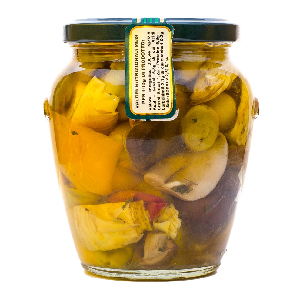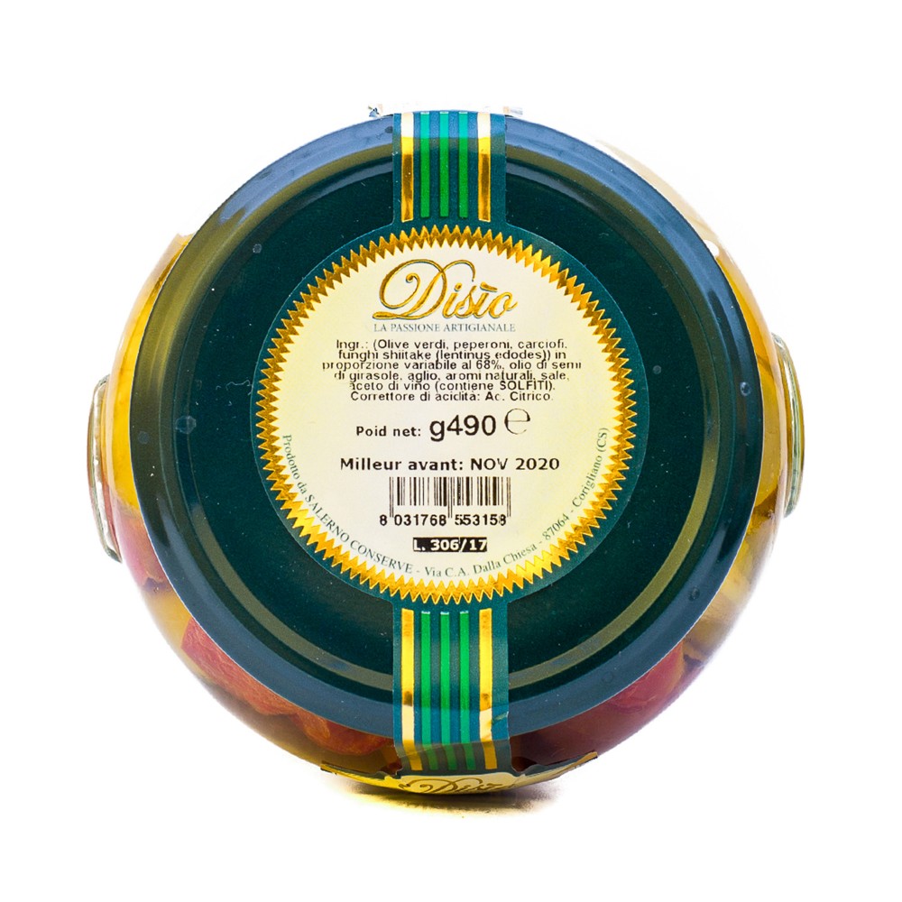 Composition | Proportion variable d’olives vertes, de piments, d’artichauts, de champignons shiitake (lentinus edodes) à 68%, huile de tournesol, ail, arômes naturels, sel, vinaigre de vin (contient des sulfites). Correcteur d’acidité : acide citrique. |
