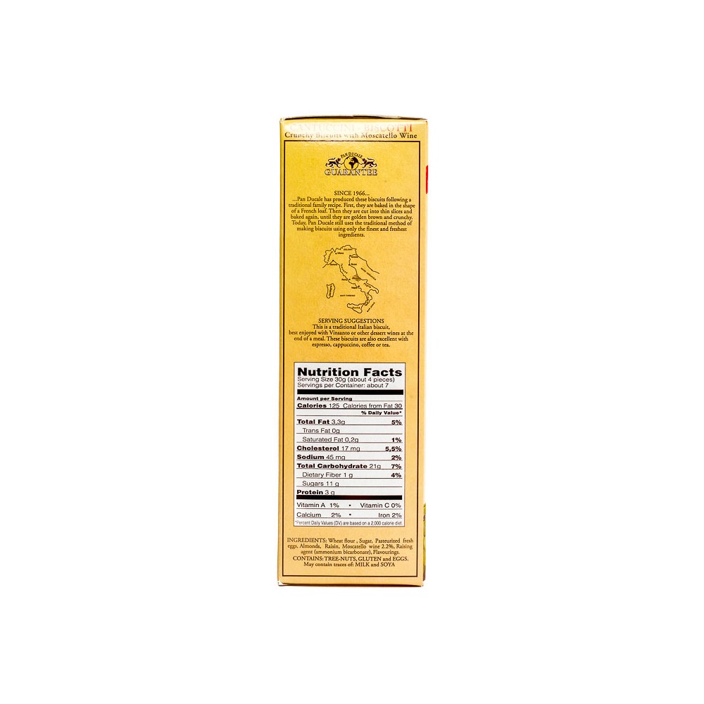 Composition | Farine de blé entier, sucre brut de canne, œufs frais pasteurisés, amandes, raisin sec, vin Moscatello (2,2%), agent de levage, arômes. |