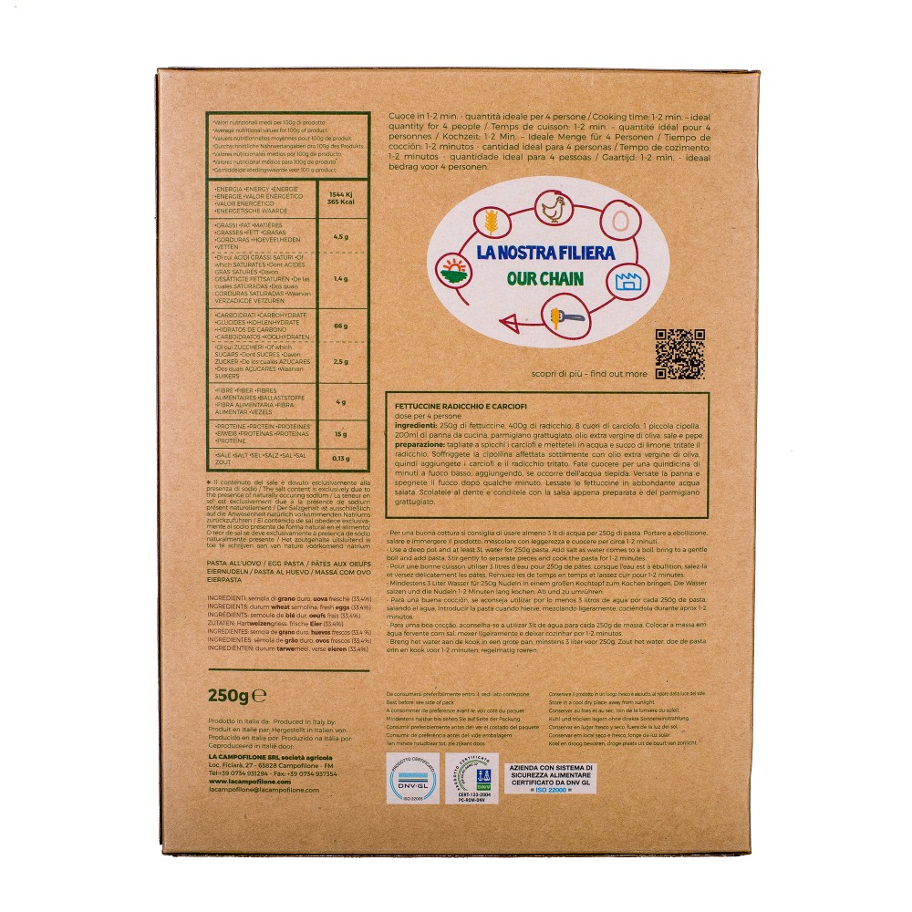 Le procédé de fabrication, alliant une préparation de la pâte à température basse suivi d'un séchage lent (20/48h), permet d’obtenir un produit de très grande qualité gustative. La technique et le savoir-faire de La Campofilone donne une pâte marquée par une grande digestibilité, une cuisson rapide et un fort rendement.