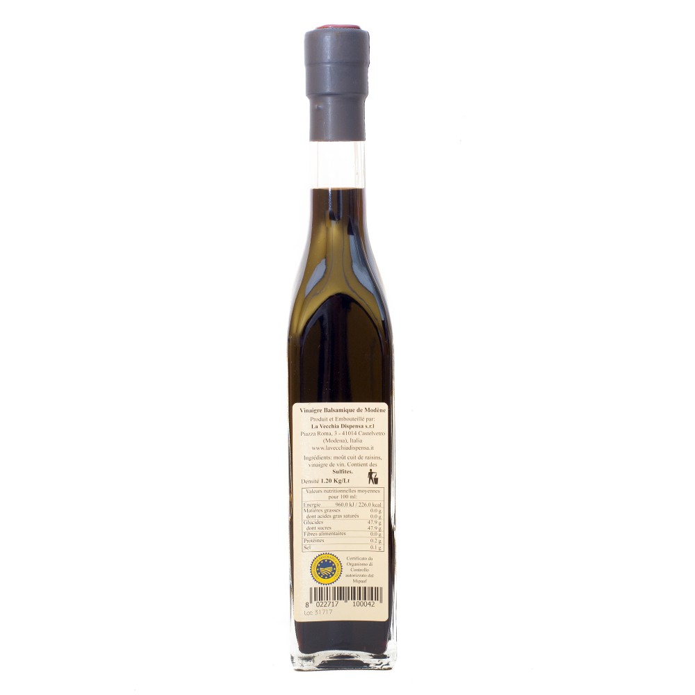 Composition | 70% Moût cuit de raisins Trebbiano (blanc) et Lambrusco (noir) ; 30% de vinaigre de vin |